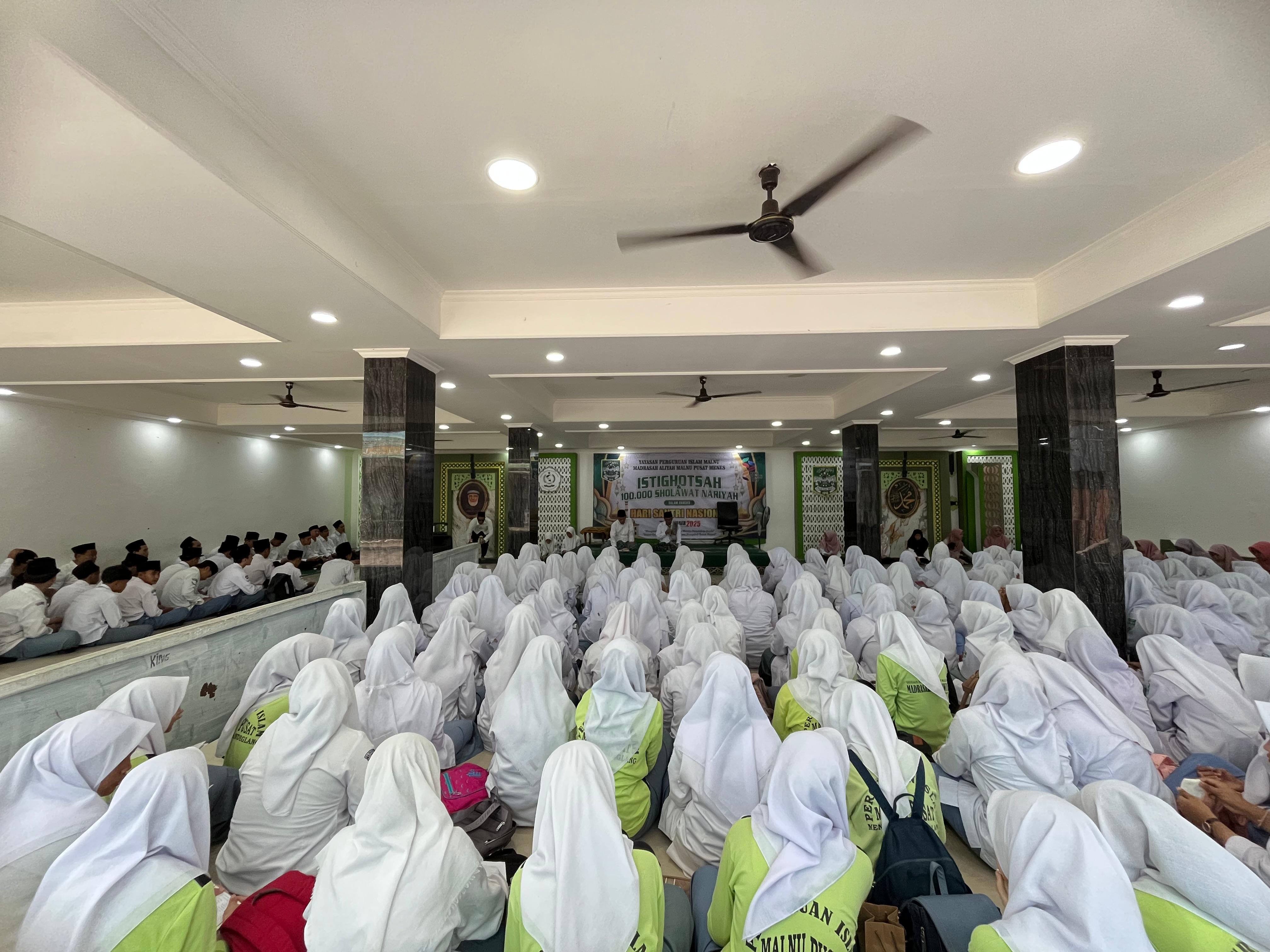 21 Oktober 2025-Dalam rangka memperingati Hari Santri Nasional tahun 2025, keluarga besar Madrasah Aliyah Malnu Pusat Menes menggelar acara Istigosah dan Pembacaan 100.000 Sholawat Nariyah di halaman madrasah pada. Kegiatan ini diikuti oleh seluruh siswa/i, dewan guru, dan warga madrasah yang hadir dengan penuh kekhidmatan.